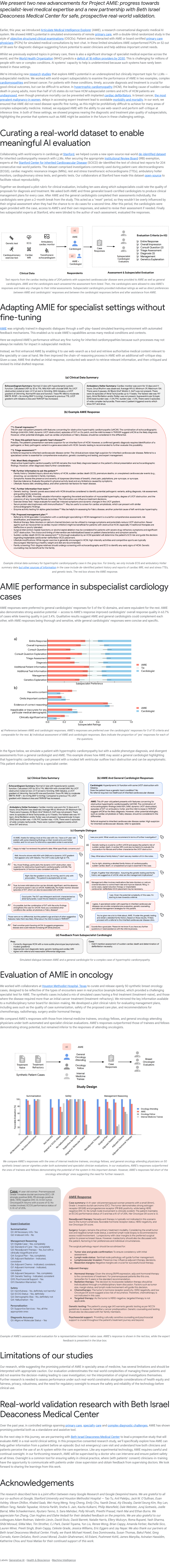 本文介绍了Project AMIE的两项新进展:向专科医生水平的医学专长迈进,以及与Beth Israel Deaconess Medical Center建立新的合作关系,以确保在现实世界中进行安全、前瞻性的验证。此前,AMIE(Articulate Medical Intelligence Explorer)作为一款研究性对话诊断医疗AI系统,在模拟远程初级护理环境中展示了其潜力。通过一项双盲随机研究,患者演员通过文本聊天与AMIE或认证的初级护理医生进行模拟医疗咨询。结果显示,在58个诊断对话轴中,AMIE在52个方面优于初级护理医生,显示出未来辅助临床医生和解决重要未满足需求的潜力。此外,全球范围内存在严重的专科医学专长短缺问题,AMIE正致力于解决这一挑战。