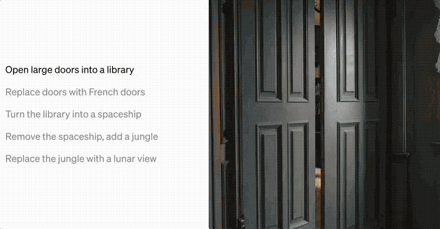 比如这样一段打开图书馆大门的视频,可以通过修改指令变换门的风格,把图书馆变成飞船、丛林、月球……