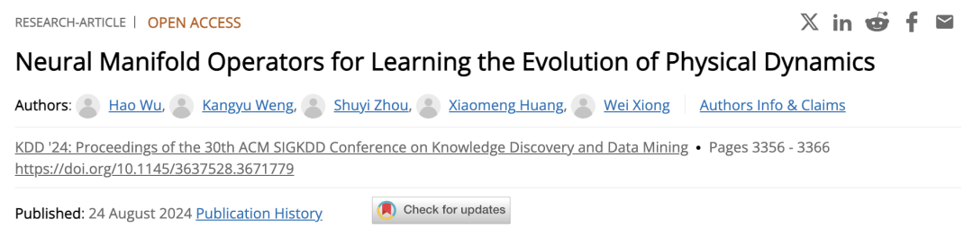 [1] Wu H, Weng K, Zhou S, Huang X, Xiong W. Neural Manifold Operators for Learning the Evolution of Physical Dynamics. In Proceedings of the 30th ACM SIGKDD Conference on Knowledge Discovery and Data Mining 2024 Aug 25 (pp. 3356-3366).