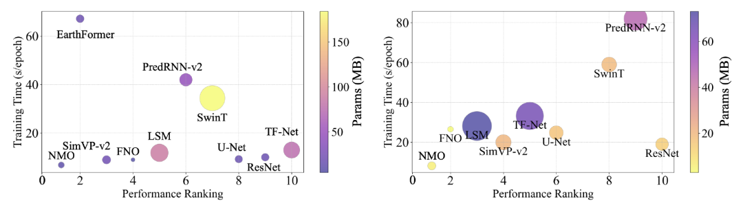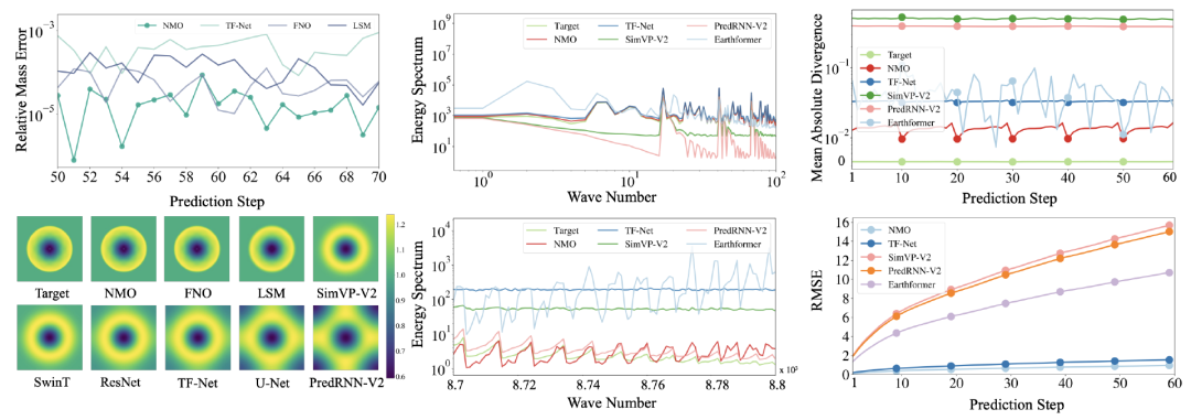经研究,使用内在维度表示的时间演化算子来学习目标物理系统的动力演化,主要具备以下优势(1)由于消除冗余维度后,模型结构更加轻量化,显著降低了计算时间和成本(见图 3);(2)在未增加物理约束的情况下,该方法能够有效避免过拟合,并准确学习物理系统中的特定物理性质,如质量守恒等(见图4);(3)与同类模型相比,无论是在真实世界场景还是在偏微分方程控制的场景下,该方法均实现了最优的建模效果(见图5)。