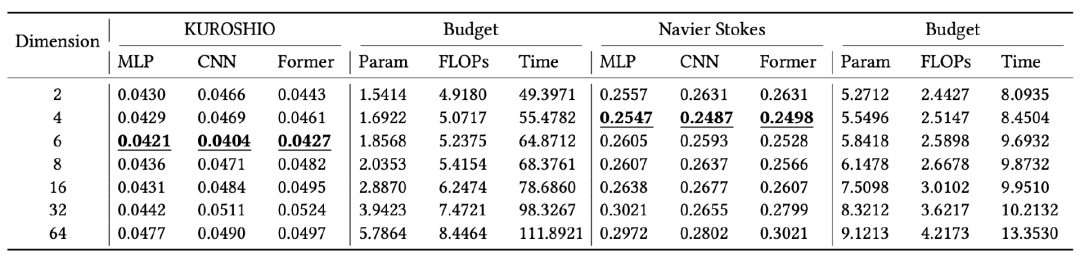 计算得到的内在维度m,在理论上应独立于模型的实现结构。为了验证模型在不同结构下的有效性,NMO模型分别尝试了基于全连接神经网络、卷积神经网络和Transformer架构实现的时间演化算子模块,由下表所示,在黑潮(一种海洋西边界洋流)和Navier-Stokes 系统下,各类结构均在内在维度m时呈现出最优效果。