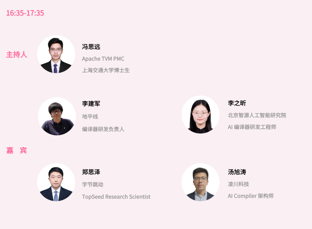 首先,我们有幸邀请到了来自地平线、北京智源人工智能研究院、字节跳动、凌川科技的 4 位资深专家,为大家分享他们的应用案例与行业观察。此外,上海交通大学博士、Apache TVM PMC 冯思远将担任圆桌环节的主持,从专业的技术角度,和嘉宾们进行思维的碰撞。