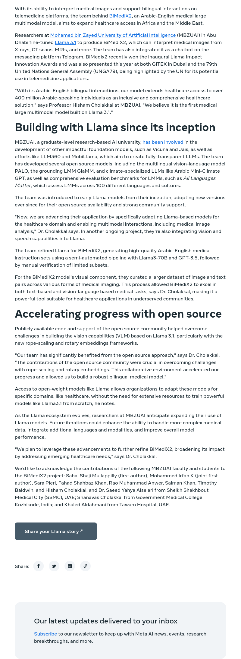 BiMediX2,一个阿拉伯语-英语医疗大型多模态模型,由阿布扎比穆罕默德·本·扎耶德人工智能大学(MBZUAI)的研究团队基于Llama 3.1微调而成。该模型能够解读X光、CT扫描、MRI等医学影像,并支持双语交互,旨在扩大非洲和中东地区的医疗保健覆盖范围。BiMediX2已集成到Telegram平台作为聊天机器人使用。近期,该模型赢得了首届Llama Impact创新奖,并在迪拜的GITEX和第79届联合国大会(UNGA79)上展出,受到联合国关注,认为其在远程医疗服务方面具有巨大潜力。通过阿拉伯语-英语双语互动,BiMediX2有望为超过4亿阿拉伯语使用者提供更广泛的医疗服务。