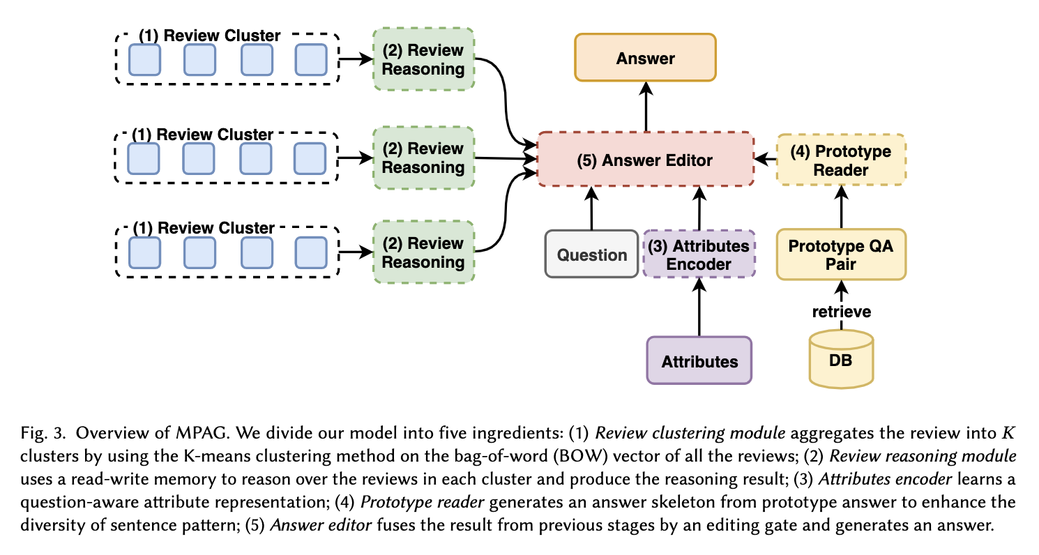在电子商务门户中,为产品相关问题生成答案已成为一项关键任务。在本文中,作者将重点放在产品感知答案生成的任务上,该任务学习从大规模的未标记电子商务评论和产品属性生成准确而完整的答案。但是,安全答案问题对文本生成任务构成了重大挑战,电子商务问答任务也不例外。为了产生更有意义的答案,在本文中,本文提出了一种新颖的生成模型,称为有意义产品答案生成器(MPAG),该模型通过考虑产品评论,产品属性和原型答案来缓解安全答案问题。产品评论和产品属性用于提供有意义的内容,而原型答案可以产生更多样化的答案模式。为此,作者提出了一种新颖的答案生成器,它具有审阅推理模块和原型答案阅读器。本文的关键思想是从大量评论中获取正确的问题意识信息,并学习如何从现有的原型答案中写出连贯而有意义的答案。更具体地说,本文提出了一种由选择性书写单元组成的读写存储器,用于在这些评论之间进行推理。然后,本文使用由全面匹配组成的原型阅读器从原型答案中提取答案骨架。最后,本文提出一个答案编辑器,以问题和以上部分为输入来生成最终答案。在从电子商务平台收集的真实世界数据集上进行的大量实验结果表明,本文的模型在自动指标和人工评估方面均达到了最先进的性能。人工评估还表明,本文的模型可以始终如一地生成特定且正确的答案。