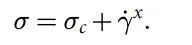 此类模型的一个例子是描述非牛顿流体(例如蛋黄酱、玉米淀粉浆或牙膏)行为的定律。它规定施加的应力 σ 等于一个应力阈值 σc ,加上剪切速率 γ 的幂律: