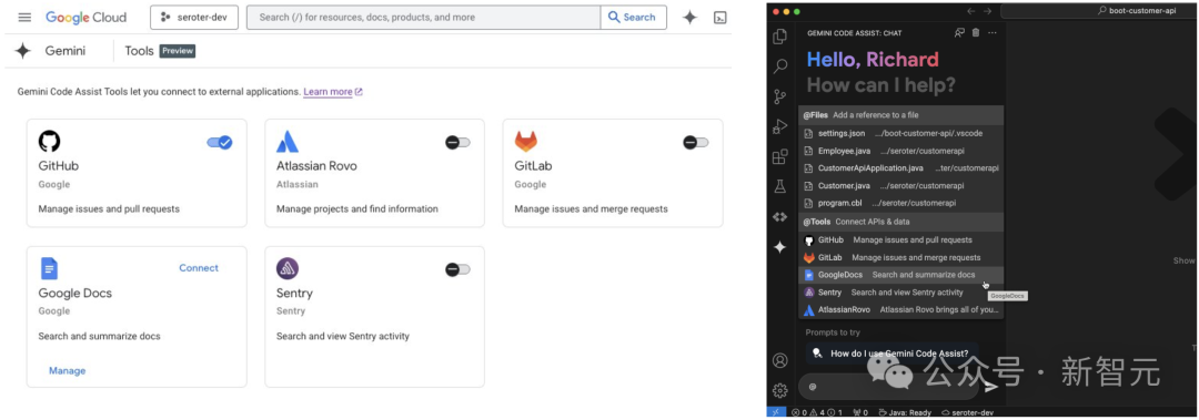 上周,谷歌发布的Gemini 2.0 Flash在编程基准SWE-bench Verified上,刷新了SOTA。它的性能完全碾压满血版o1、Claude 3.5 Sonnet,成为公认的最强编码AI。就在今天,谷歌宣布在Gemini Code Assist中,集成最新模型Gemini 2.0 Flash,并推出了一系列工具。由此,开发者们可以将外部系统加入IDE,直接与GitHub、GitLab、Sentry、Google Chrome和Atlassian交互。在此之前,Gemini Code Assist已经接入了VS Code和JetBrains。谷歌云产品管理高级总监Ryan J. Salva表示,这个想法是为编码任务扩展更多的上下文,而不中断工作流程。开发者只需进入Code Assist聊天页面,说明需要处理的数据,然后LLM可以自动从数据源查询并对其分析。为了给开发者们提供便捷,谷歌计划未来还将更多工具,直接集成到Gemini Code Assist中,比如可观察性工具、安全软件以及数据库。从ChatGPT可以协助编码之后,人工智能编码助手是GenAI的首批重要用例。GitHub、甲骨文、Harness纷纷推出了以企业为重点的编码助手。与此同时,OpenAI和Anthropic对外提供API接口,让程序员直接在聊天平台上编程。比如,我们可以直接在ChatGPT中的Canvas运行Python代码,还能进行交互性的编辑生成。Anthropic推出的Claude Artifacts,与Canvas产品理念相同,皆是便于开发者们生成、编辑和运行代码。另外,OpenAI还在ChatGPT MacOS桌面应用程序中添加了与VS Code、XCode、Terminal和iTerm 2等工具的集成。据Gartner估计,「截止2028年,90%的企业软件工程师将使用AI编码助手,这一比例在2024年初还不到14%」。谷歌宣称,Gemini Code Assist企业版已超越了IDE中的AI编码辅助功能,不仅可以理解本地代码库,还可以定制代码,提供代码建议。它的定制功能可索引来自GitHub和GitLab的repos,并将于2025年初支持其他源码控制系统和自托管的内部repos。同时,它还能完成复杂的任务,如在整个软件包中升级Java版本。此外,企业版提供了企业级安全以及法律赔偿条款。在推出Gemini 2.0时, 谷歌同步发布了编码工具 Jules。Salva表示Code Assist与其完全隔离,Code Assist仍是唯一由Gemini支持的通用企业级编码工具。https://venturebeat.com/ai/google-ai-agents-multimodal-ai-enterprise-search-will-dominate-in-2025/