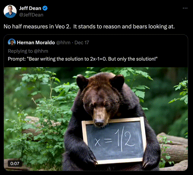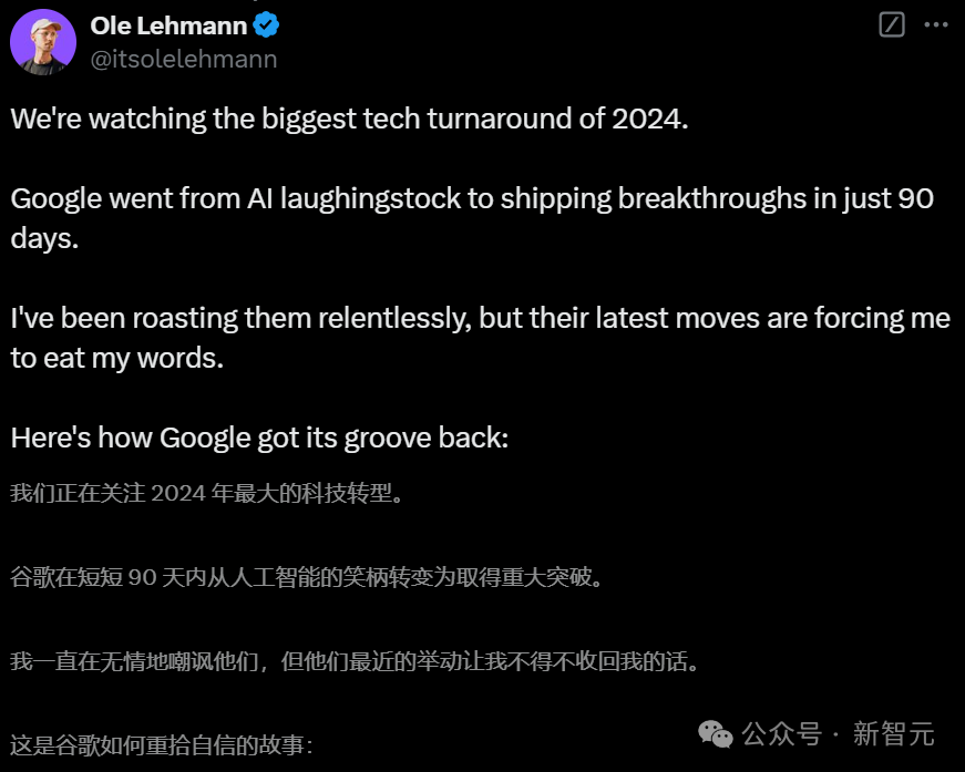 声明:目前一切都还未定论,我的分析仅是对现状的一瞥早在2017年,Sam Altman在一次邮件交流中就明确表示,谷歌DeepMind是在AGI竞争中最大的对手。当时,他还未能预见其他玩家会加入这场竞争。不过,估值180亿美金Anthropic的崛起,证明了新玩家也能翻身成巨头。Meta通过「开源」(虽然并非真正的开源)另辟蹊径,避免了与谷歌占据主导地位路线的直接竞争。ChatGPT如同一匹黑马,自2022年横空出世以来,OpenAI一直牢牢掌握着AI的话语权。与此同时,ChatGPT成为了「AI」的代名词。凭借此,奥特曼带领着团队迅速征服消费市场,甚至直接带飞了微软。最初的几轮交锋中,谷歌试图通过Gemini去挽救落下的成绩,并期望以此获得市场青睐,但总是未能如意。此前,AI Overview总结能力大翻车,遭到网友连连的吐槽。比如,建议孕妇吸烟、建议自杀跳桥、建议用胶水将胶水和披萨固定在一起....更耐人寻味的是,OpenAI几乎毫不费力,每次都能在谷歌发布新产品前后抢尽风头。即便在模型推理能力上,到目前为止,OpenAI也一直是遥遥领先。人们不理解的是,谷歌DeepMind拥有世界上最好的资源,为什么会在这场竞争中略显得仓促和被动?与OpenAI不同,他们有大量用于训练推理的TPU、更多的训练数据(比如YouTube),以及DeepMind这个世界级研究机构和顶尖人才。DeepMind团队也在努力用实力,去证明这一切。在科学领域,AlphaFold、GenCast等等,取得了难以置信的成就。但这些研究成果,在消费市场上并没有给谷歌带去任何实质性的帮助。甚至,就连Anthropic这样后来者,也赢得了AI社区更多关注和支持。然而,这种局势在12月发生了戏剧性的逆转。突然间,谷歌发力给OpenAI来了当头一棒。就在OpenAI接连献上12天产品秀之际,谷歌推出了两款惊艳的模型——Gemini 2.0 Flash和Veo 2。Gemini 2.0 Flash在所有基准测试中,超越了GPT-4。AI视频模型Veo 2直接吊打Sora,展现出令人惊叹的物理世界理解能力。它还能根据提示中的方程式2x-1=0,直接生成出得到解答x=1/2的视频。关于新模型的亮相,谷歌并没有做任何事先的炒作和预热,用低调有力的方式做出了反击。而对于,过去一年总结,和未来一年技术预测,谷歌也有话要说。