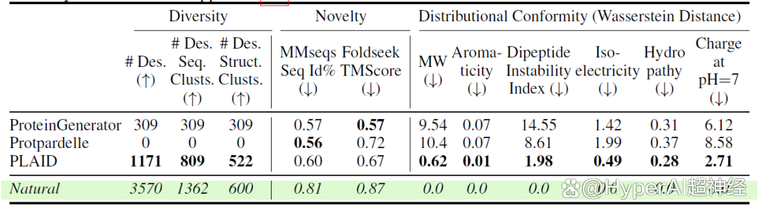 研究人员也进一步评估了不同模型的多样性、新颖性和自然性,结果如下表:在全原子模型中,PLAID 在序列和结构空间中均生成了最多的独特且具有设计性的样本。