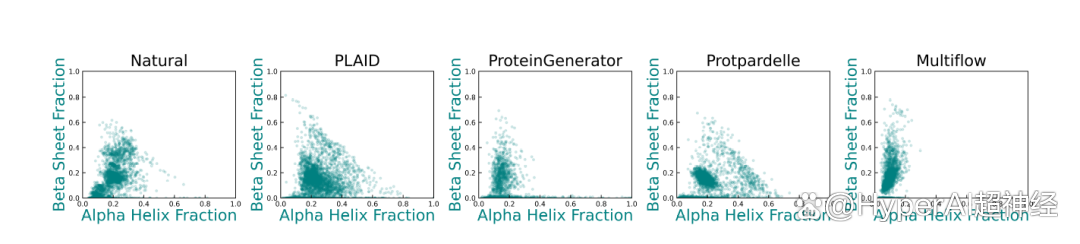 * 该图展示了天然蛋白质及不同生成方法中蛋白质结构的 α-螺旋和 β-片层含量分布。每个点表示一个结构,其坐标表示 α-螺旋残基比例 「x 轴」和 β-片层残基比例「y 轴」)