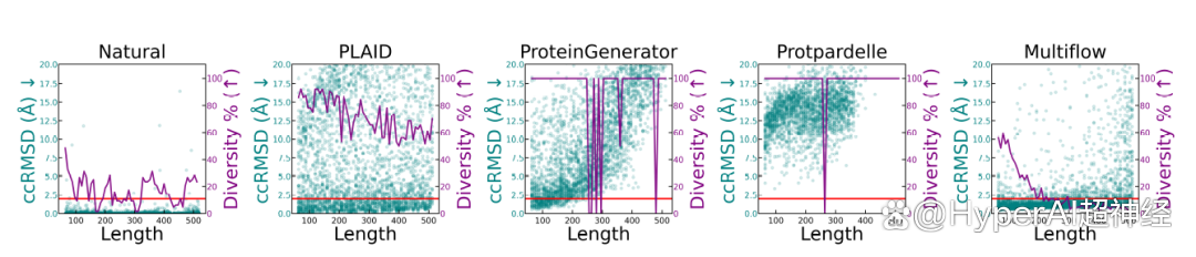 * 该图对比天然蛋白质和不同生成方法,展示了蛋白质在不同长度 (64-512 个残基) 下的结构质量 (ccRMSD,青色点) 和多样性 (紫色线,以独特结构簇占总样本比例衡量)。红线位于 2Å,表示设计性阈值)