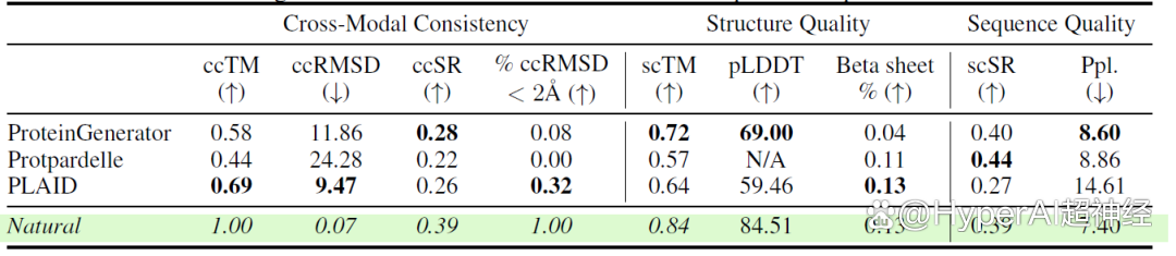 研究人员还比较了不同模型在全原子蛋白生成任务中跨多种一致性 (Consistency) 和质量指标 (Quality metrics) 的表现,结果如下表:PLAID 生成的样本在序列与结构之间表现出高度的跨模态一致性。