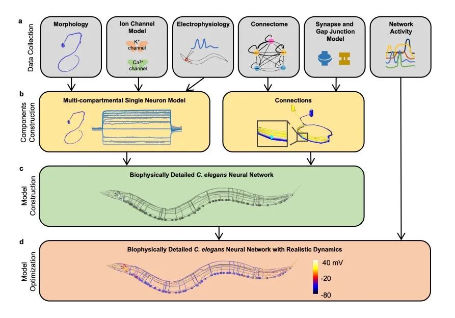 研究团队基于线虫神经元的真实生理特性,构建了一个生物物理层面上的高精度神经网络模型。神经网络模型中的每个神经元都被表示为一个多舱室模型,模拟神经元的结构和功能部分(如胞体、神经突),以精确复现秀丽隐杆线虫神经元的电生理特性以及基于实验数据的精细突触和间隙连接结构。该模型是目前已知首个同时在神经元层面和神经网络层面都具有真实动力学特性的,基于多舱室建模的高精度秀丽隐杆线虫神经网络模型。