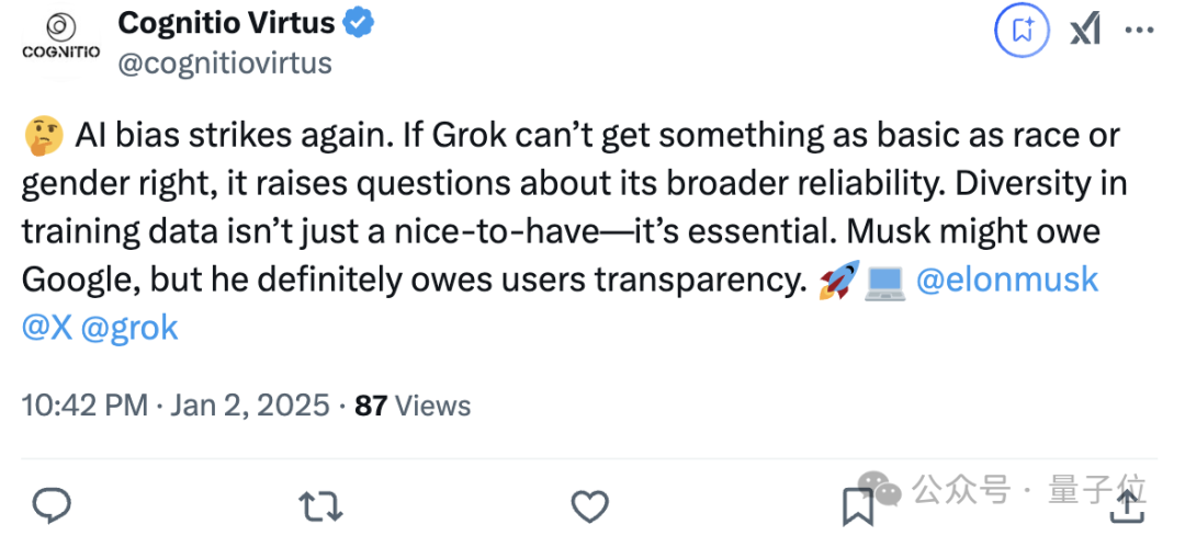 AI偏见再次出现,训练数据的多样性不是可有可无的,而是必不可少的。马斯克可能欠谷歌,但他肯定欠用户一个透明的交代。