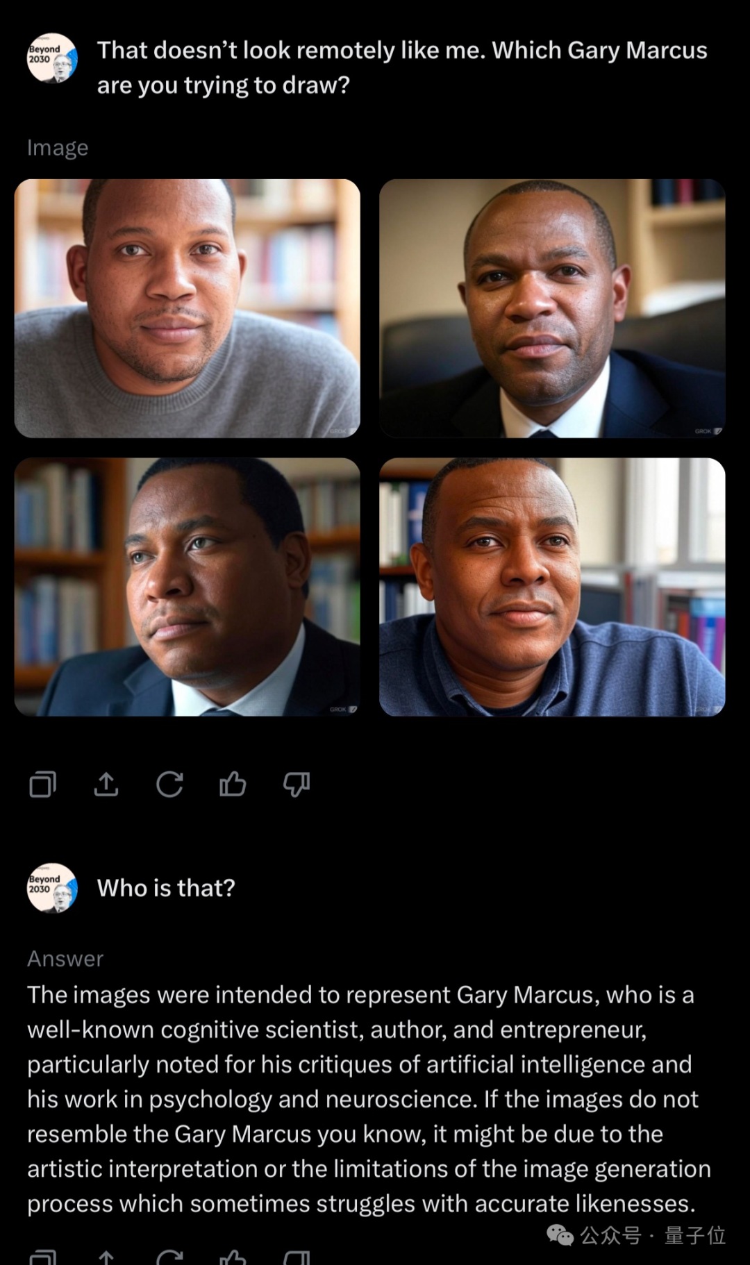 关键是,让Grok回答“这画的是谁”,它的表述还是正确的,也就是说它知道这个人,但就是画不对。