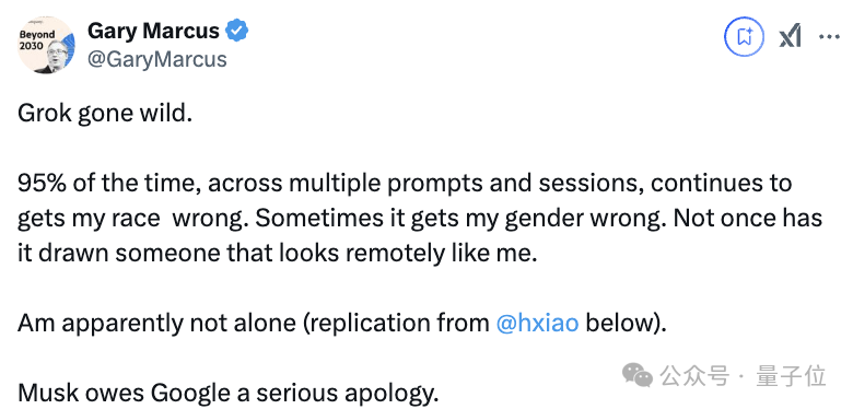 著名AI悲观派学者Gary Marcus多次尝试后正式“确诊”Grok失控。