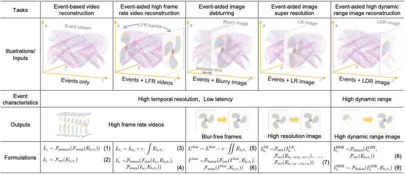 (第2行以拍摄旋转扇叶为例,展示不同任务下事件辅助图像/视频增强算法的输入示意图)