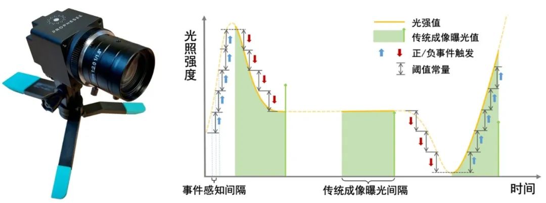 图2. 左:Prophesee 事件相机[4]|右:事件相机成像原理示意图[2]