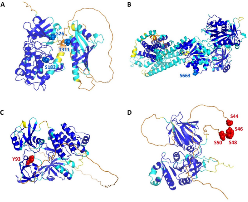 图4. MMFuncPhos 预测了 CaMKIIβ (A)、SERCA2 (B)、Src (C) 和 NADK (D) 中的功能性磷酸化位点,EFuncType 预测了这些磷酸化位点的调节类型。蓝色标签表示抑制酶活性,红色标签表示增强酶活性。
