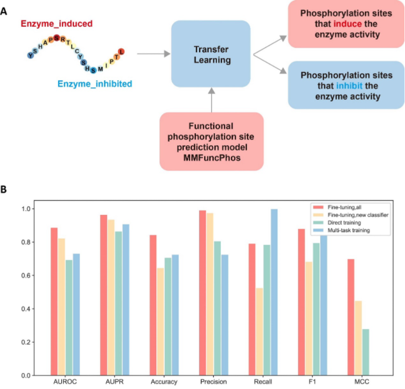 图3. 基于迁移学习预测磷酸化对酶活性的调节类型的模型EFuncType。(A) EFuncType模型的框架。(B) EFuncType(Fine-tuning, all)及其他模型的性能表现。