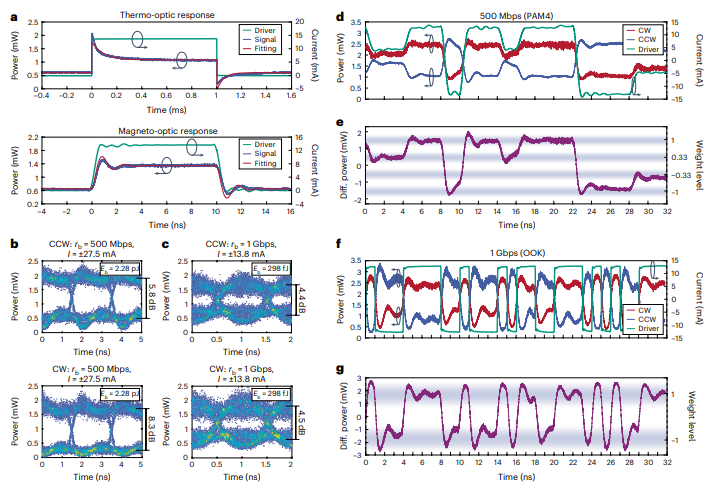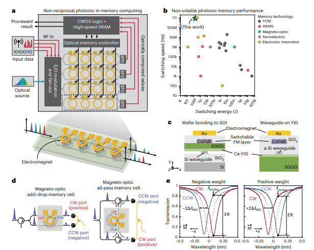 1. 非互易光学内存架构:图1展示了基于微环谐振器(MRR)和磁光材料的光内存架构,强调了其编程速度和非易失性。图1b对比了不同非易失性光学内存技术的速度与能耗,展示了新架构的优势。