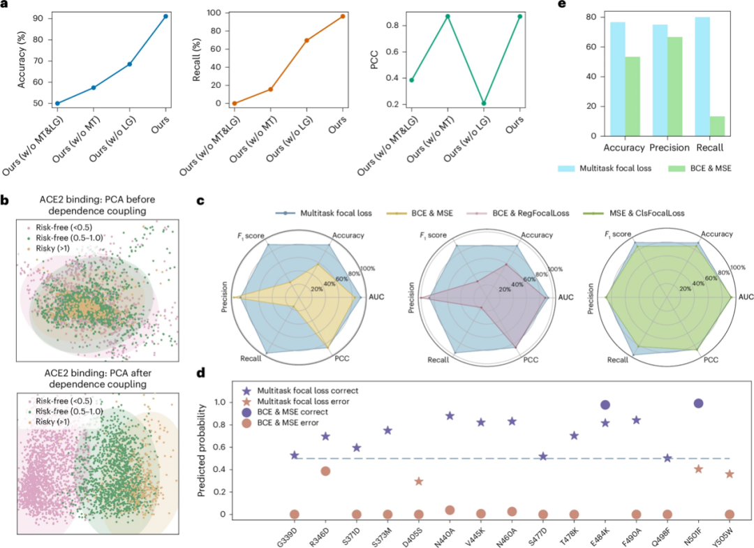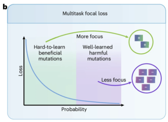 更重要的是,如上图 b 所示,团队设计了新颖的多任务焦点学习损失函数 (Multi-task focal loss),促使模型在训练时更加关注难以被有效学习的稀少有益突变,从而大幅度提升对于稀少有益突变(即难样本)的预测表现。