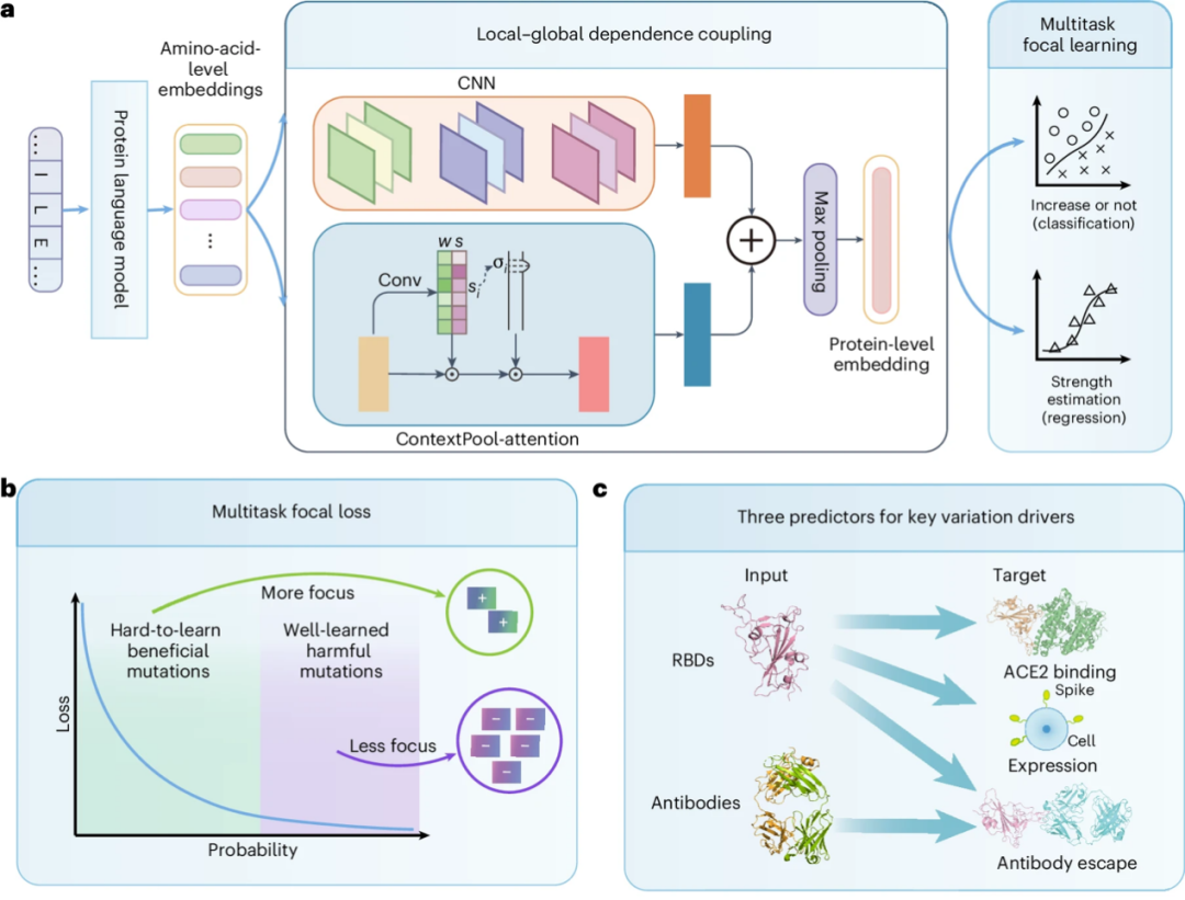 研究团队基于「微弱突变放大」和「稀少有益突变挖掘」的设计,提出了进化驱动的病毒变异驱动力预测框架 E2VD。如下图 a 所示,主要包括 3 个模块,分别是蛋白质序列编码、局部-全局相互作用依赖融合 (Local-global dependence coupling) 和多任务焦点学习 (Multi-task focal learning)。