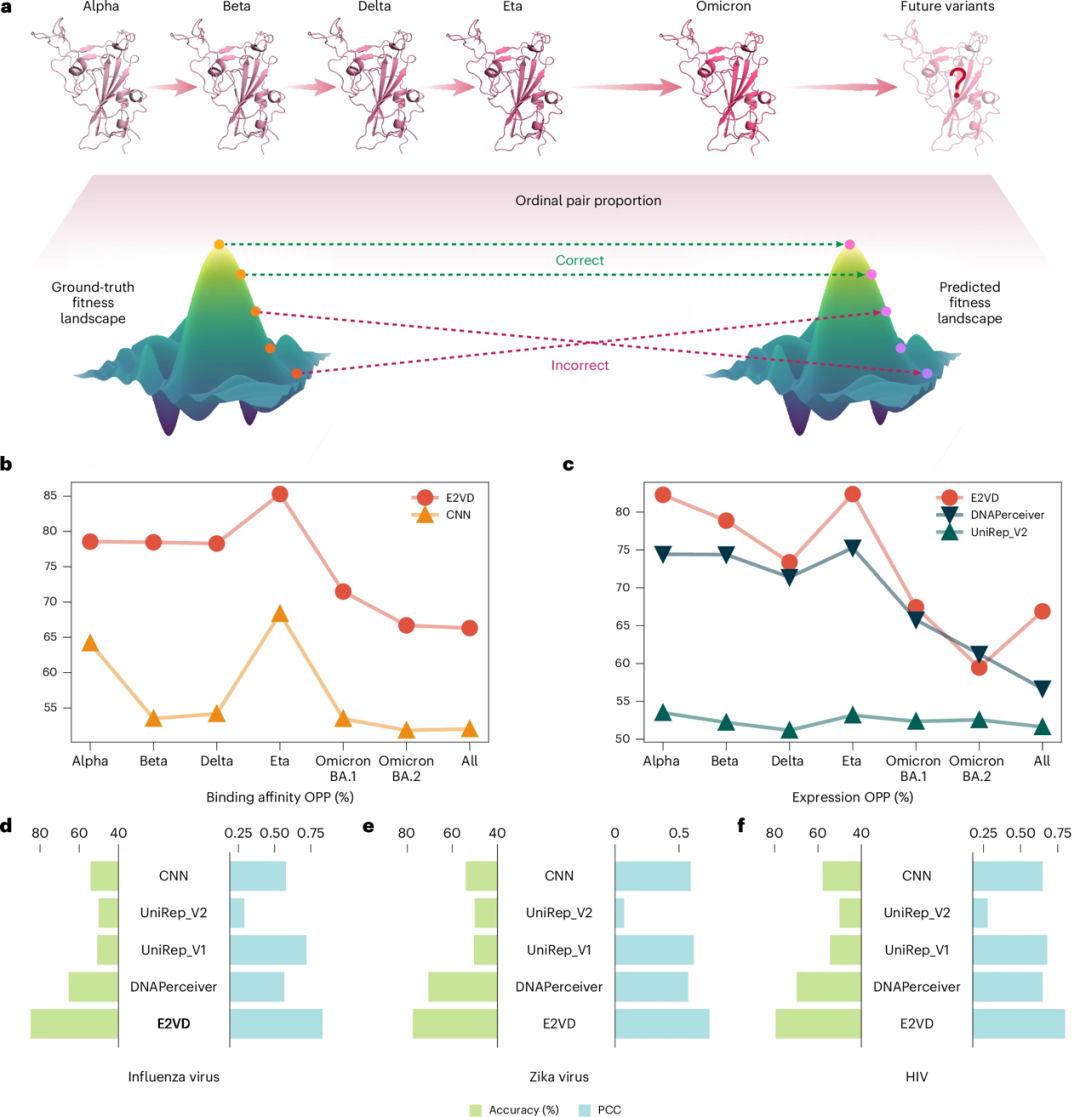 * b、c:E2VD 预测病毒不同毒株的 OPP;d、e、f:E2VD 预测不同类型病毒的性能