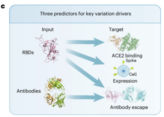 * 针对 SARS-CoV-2 的任务包括结合亲和力 (Binding affinity)、表达量 (Expression) 和抗体逃逸 (Antibody escape) 的预测,这 3 个任务是病毒变异的关键驱动因子。