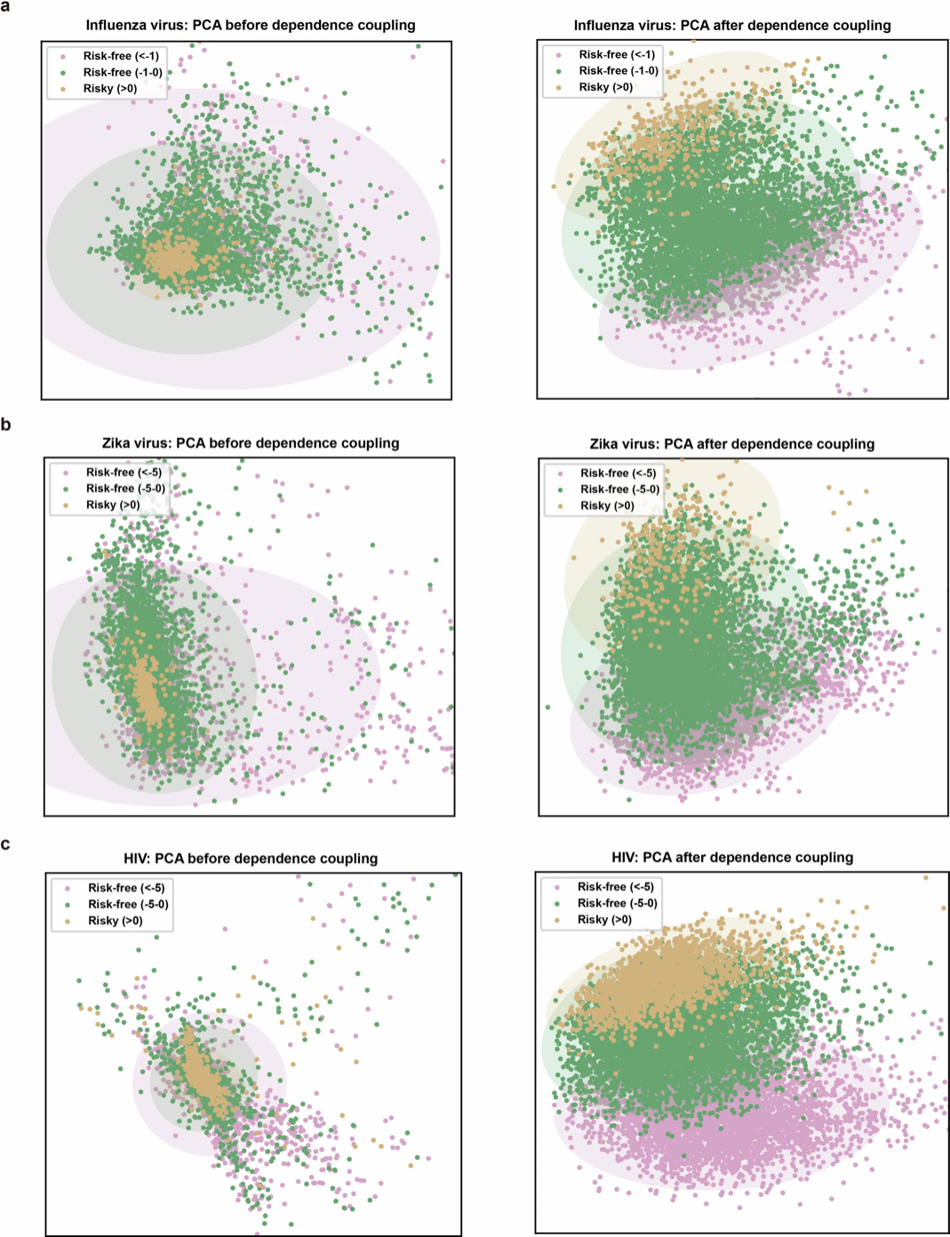 如下图 b 所示,研究人员用主成分分析 (PCA) 对流感、寨卡和艾滋病病毒中 3 种类型的突变进行降维可视化,结果发现,在 LG 模块处理后,不同突变的特征被清晰地区分开,边界明确。这说明,LG 通过捕获和重建分子内相互作用网络,可增强 E2VD 对各种突变类型的敏感性,从而更好地理解病毒的进化适应性。