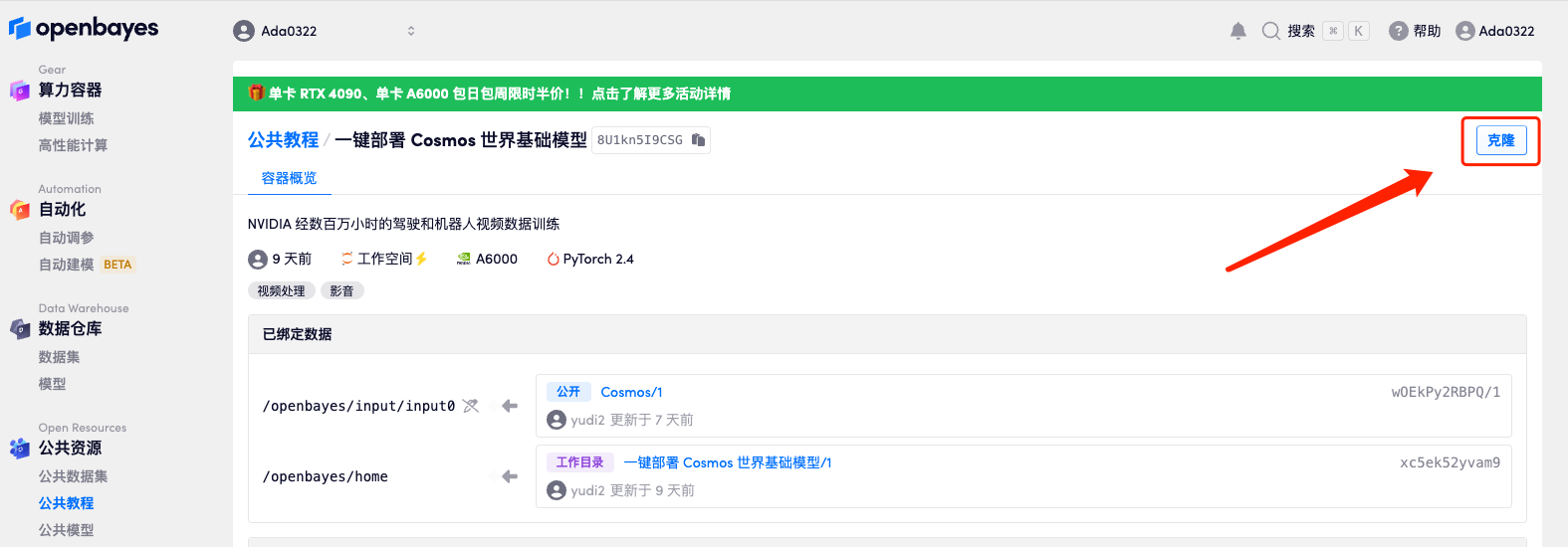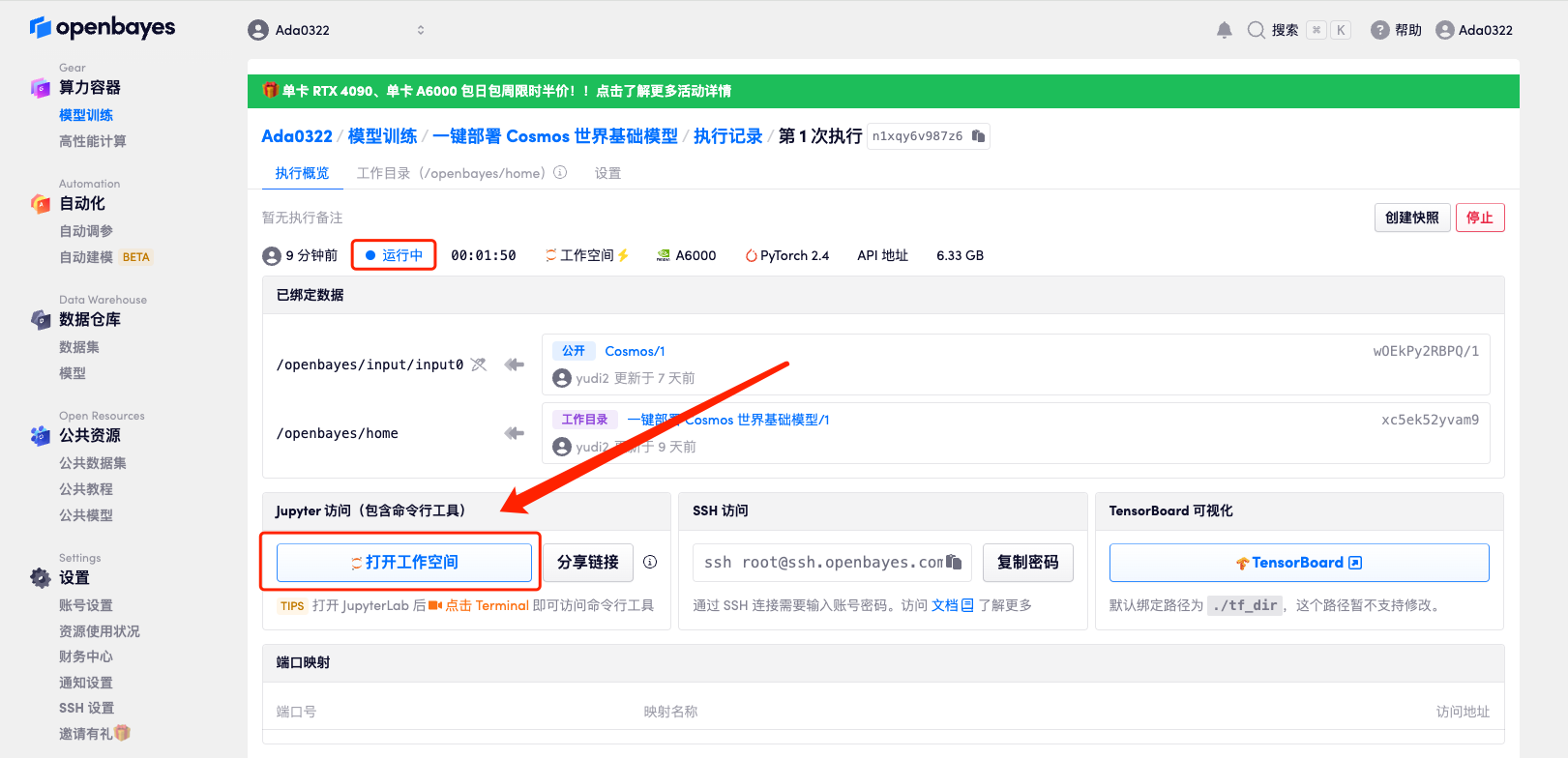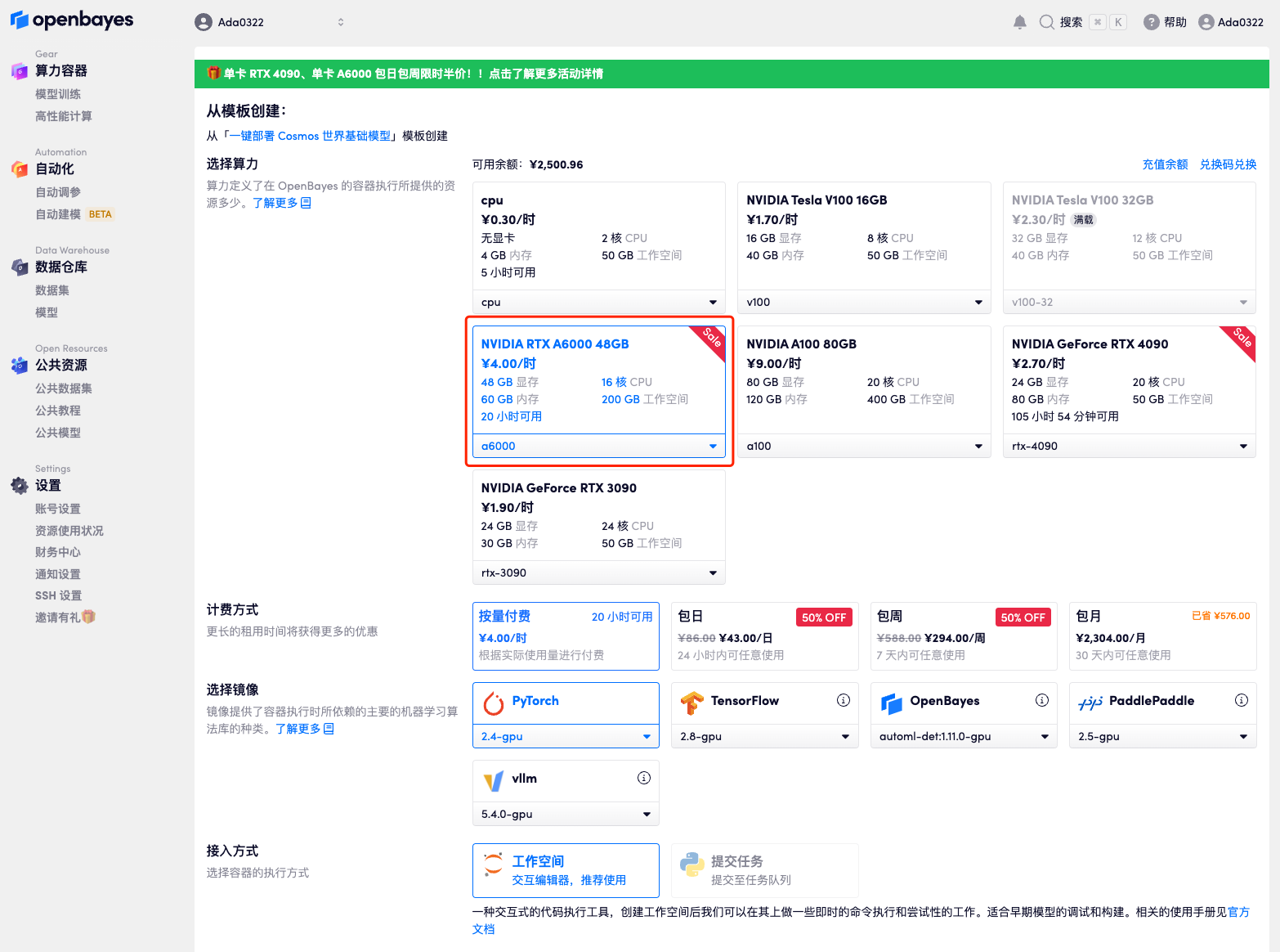 另外,OpenBayes 新春活动进行中,单卡 RTX 4090 与 RTX A6000 包日/周均有半价福利!