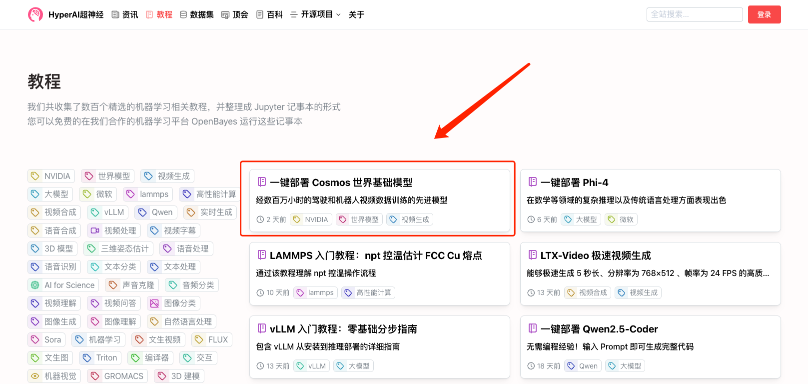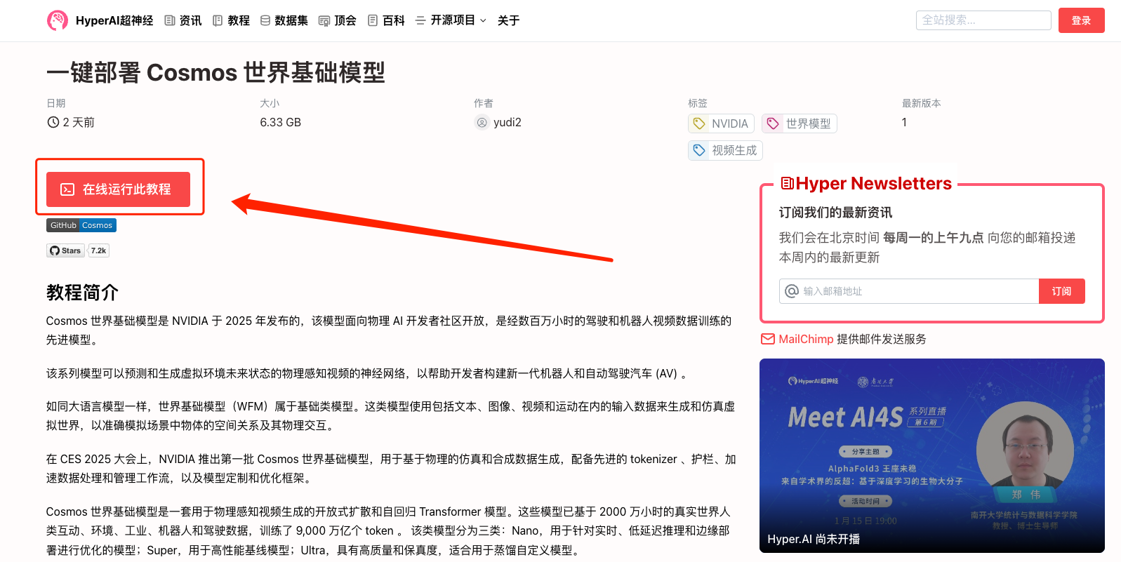 1.登录 hyper.ai,在「教程」页面,选择「一键部署 Cosmos 世界基础模型」,点击「在线运行此教程」。