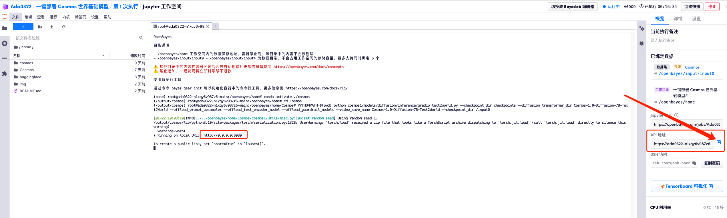 待出现 8080 端口后打开右侧 API 地址访问 gradio 界面即可。