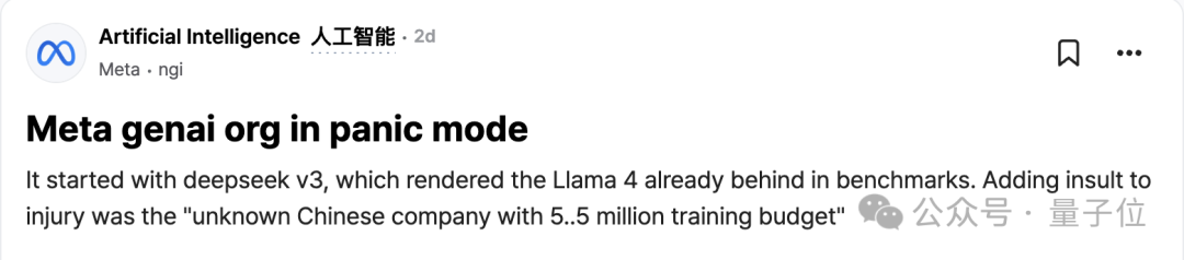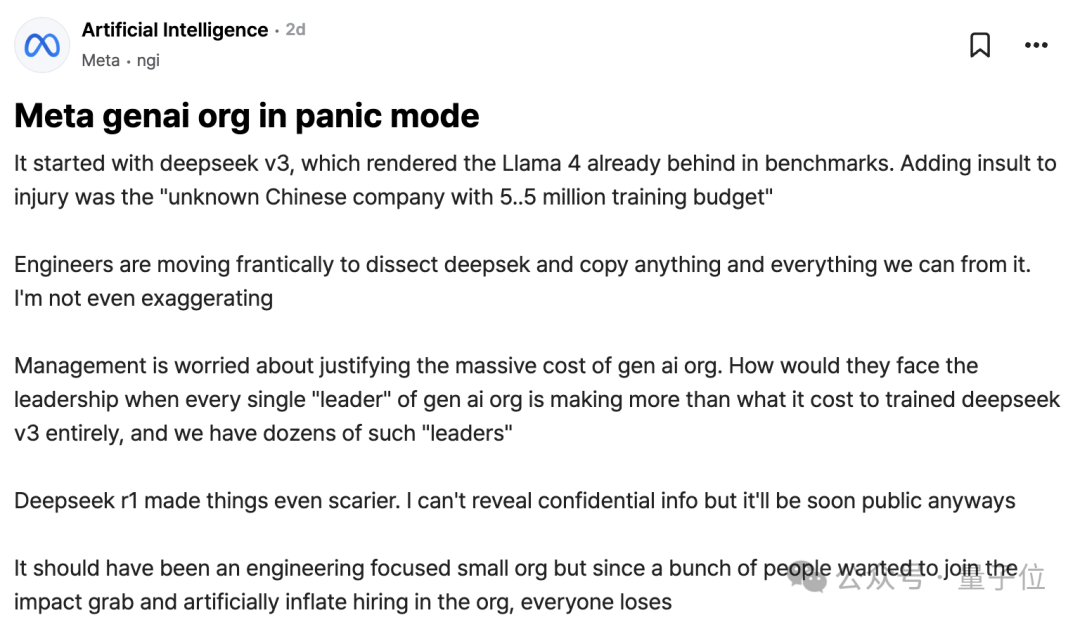 在TeamBlind上,工程师爆料称这种恐慌由DeepSeek而起,并且在DeepSeek V3(24年12月末发布)的时候就已经产生。