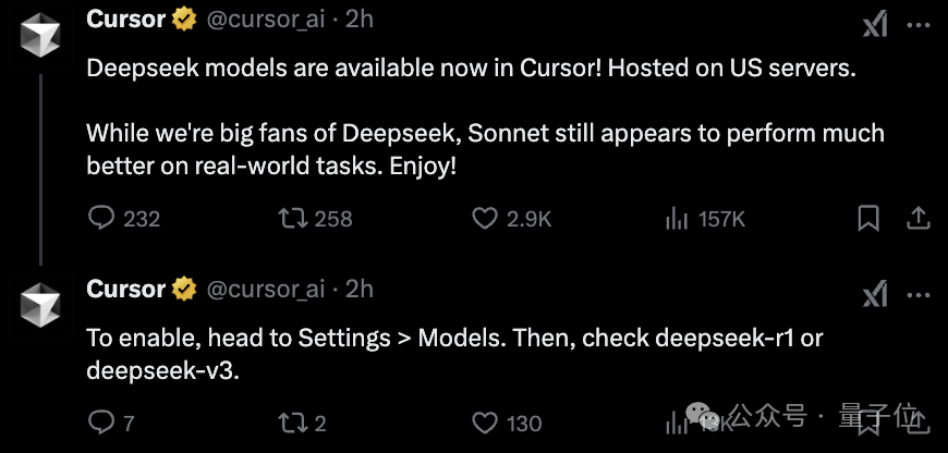 继微软前脚指指点点,后脚就在自家AI平台上接入了DeepSeek模型之后,程序员们最爱的Cursor今天也最新宣布: