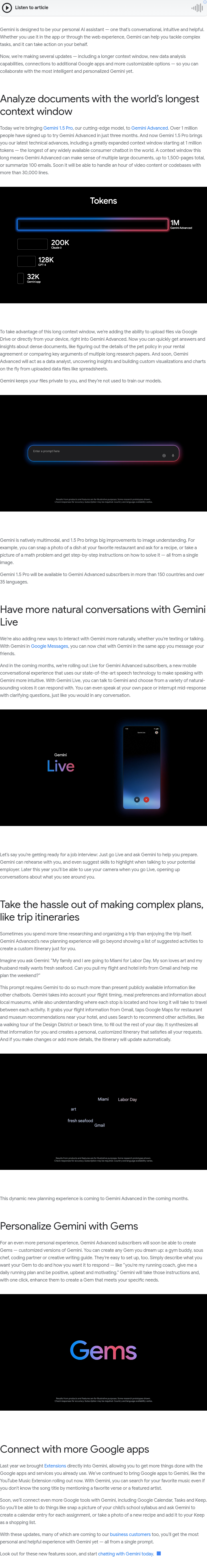 Gemini是一款设计为个人AI助手的工具,具备对话性、直观性和实用性,可在应用程序或网页端帮助用户处理复杂任务并代为执行操作。近期,Gemini进行了多项更新,包括延长上下文窗口、新增数据分析功能、连接更多Google应用及提供更个性化的选项,使协作更加智能和个性化。 特别是Gemini 1.5 Pro版本引入了长达100万tokens的上下文窗口,这是目前市场上最长的消费者聊天机器人上下文窗口,能更好地理解多文档内容。此外,超过100万人在短短三个月内注册试用Gemini Advanced,体验其最新的技术进步。这些改进使得Gemini不仅能在长篇幅文档分析中表现出色,还能通过与Google应用的集成,提供更多样化的服务和支持。