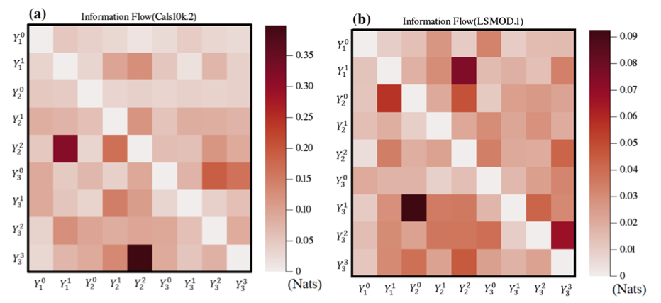 此外,MJO 作为厄尔尼诺-南方涛动(El Niño Southern Oscillation,下文简称 ENSO)的“随机”推动机制而发挥着重要作用,并因其与北大西洋涛动和其它遥相关(teleconnection)模式的相互作用而与全球极端气候和气象事件的发生有关。论文 [23] 的作者们利用因果关系概念在复杂网络中的应用,推断了与Madden–Julian 振荡相关的赤道波相互作用的特性。