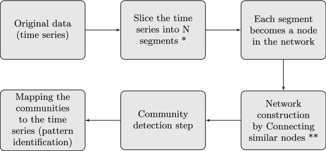 Anghinoni等人[6]展示了一种使用复杂网络工具识别时间序列模式的方法。该方法首先根据时间序列不同片段之间的相关性,将时间序列转换为网络,然后通过网络指标(如模块度)捕获重复层级模式的存在,例如社团检测过程中的模块化。