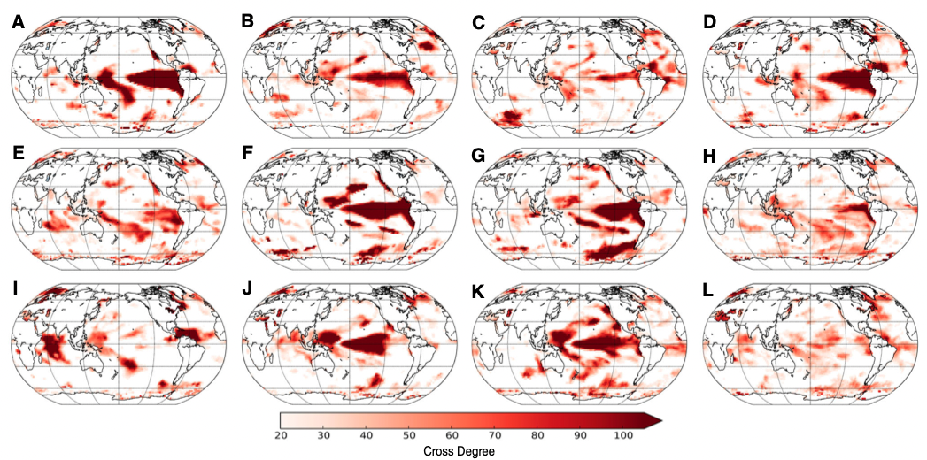 Ekhtiari等人[24]采用耦合气候网络分析,来表征月度尺度上海面温度与降水之间的主要全球协变模式。他们的分析揭示了与本地和远程统计联系相关的特征季节性模式,并证明了它们对当前ENSO阶段类型的依赖性。