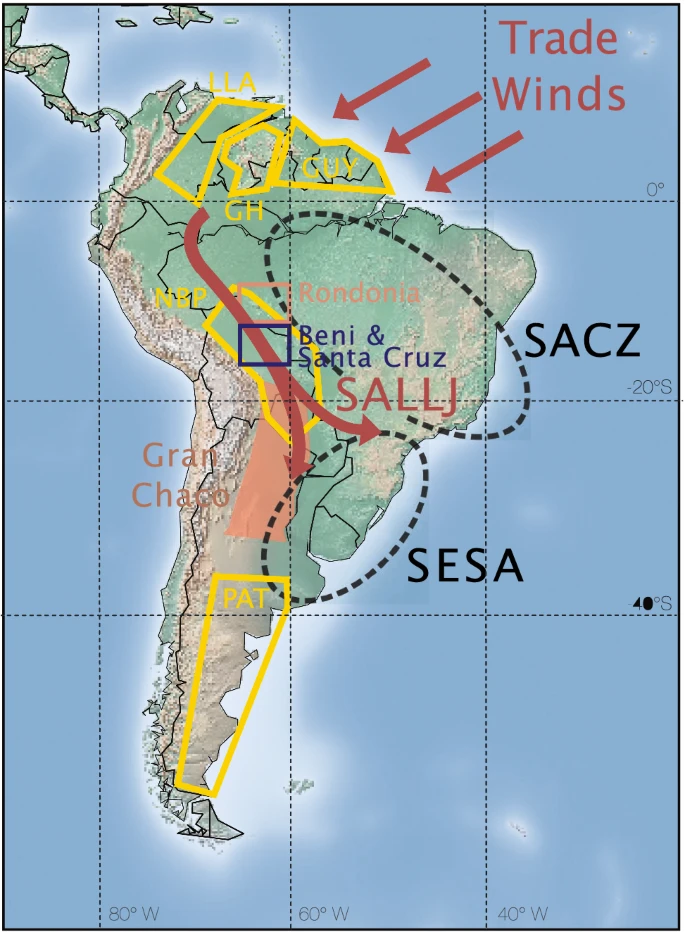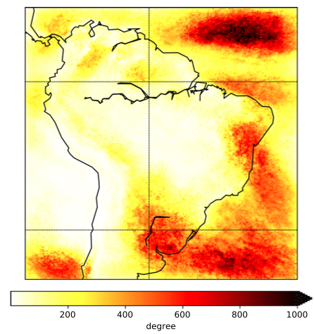 Gelbrecht等人[29]利用流风网络(streamflow wind networks,一种跟踪风场局部流动的气候网络)以及对风、降水和位势高度场(geopotential height fields)的复合分析,研究了南美低层环流的可变性。
