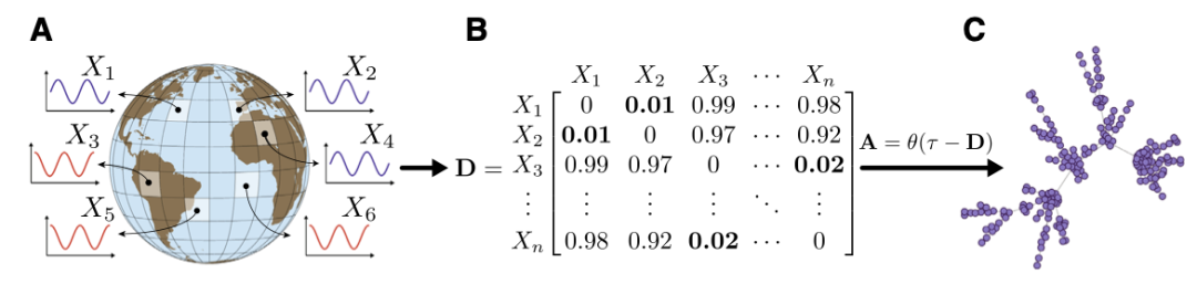 Ferreira 等人[21]对功能性气候网络进行了研究。功能性气候网络中的模式对于气候动力学的研究十分重要,因为它们通常揭示了能量的长距离传输路径,可用于预测次季节(subseasonal)至年际甚至十年尺度的气候变化。作者基于全球温度数据,系统性地研究了29个时间序列距离函数对功能性气候网络构建的影响。他们观察到,过去文献中使用的距离函数通常会生成非常相似的网络,而替换后的函数则会生成相当不同的网络结构,从而揭示不同的远程连接。