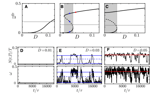 在可激发系统中,超阈值刺激会引起强烈的反应,即“事件”。事件的生成通常由缓慢的反馈过程所调控。Kromer[2]使用主动旋转器模型,研究了可激发系统中噪声和事件触发反馈机制的相互作用。首先,文章回顾了具有正反馈的单个主动旋转器的最新研究结果:反馈可能导致突变,这是由亚阈值和超阈值机制之间的随机切换导致的,这两种方案能在有限的噪声强度范围内共存。
