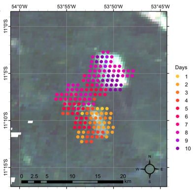 Cano-Crespo等人[25]实现了一种基于复杂网络的方法来追踪单次火灾的时空动态。他们关注了2002-2019年间亚马逊热带雨林的火灾中最强烈的5%的极端火灾,结果观察到,增加森林可燃性的重大干旱与极端火灾的年份时常重合,此外他们还说明了人类活动的重要作用。