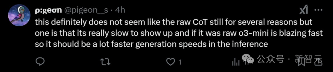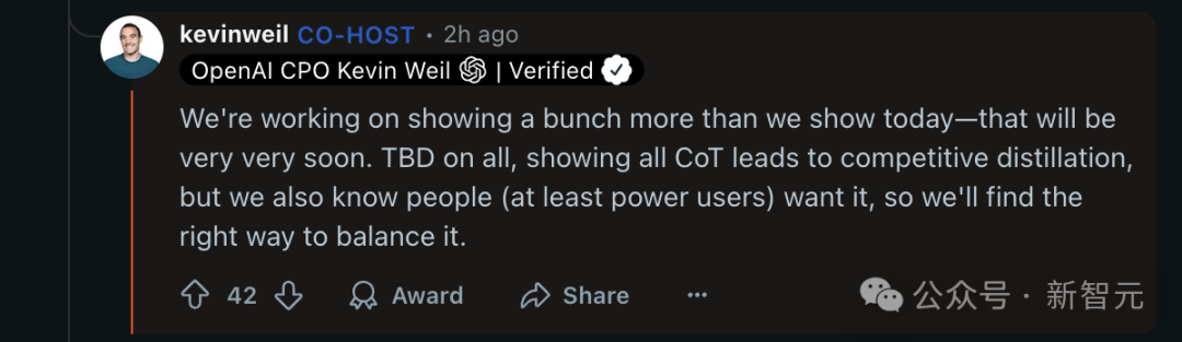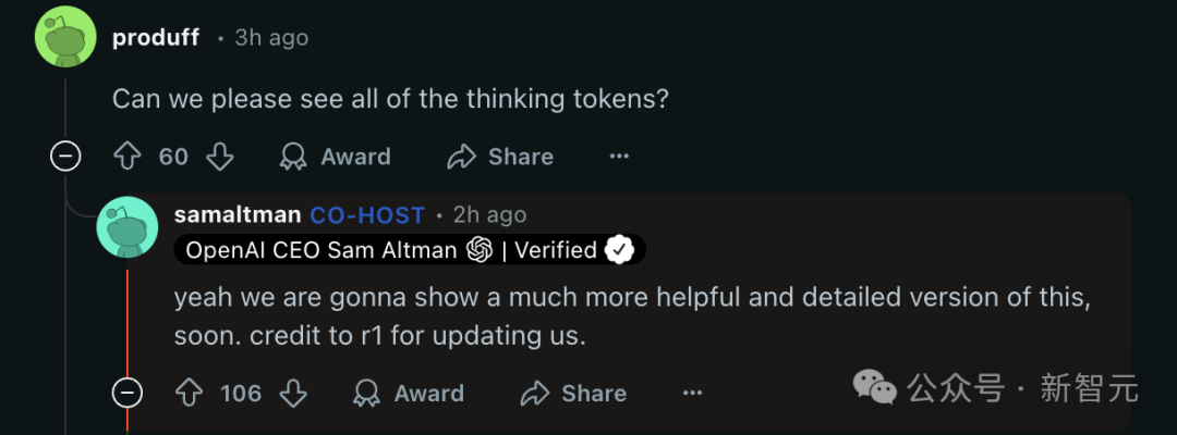 OpenAI这波植入CoT总结器的做法,着实是被DeepSeek R1强势崛起吓到了。o3-mini发布当天,OpenAI在Reddit开启AMA在线问答中,网友曾提问,「我们能看到模型思考的所有token吗」?当时,奥特曼回复道,「我们很快就会展示一个更有帮助、更详细的版本」。紧接着,OpenAI首席产品官Kevin Weil提前暗示了,是否展示所有内容还有待确定。「我们知道用户(至少是高级用户)想要看到这些,所以OpenAI会找到一个合适的平衡点。」如今,当所有人终于见到了奥特曼所谓的「留到最后的好东西」,感受到的只有失望。毕竟,DeepSeek早已这样做了,而且还是完整的原始CoT!对此,OpenAI发言人表示,「为了提高清晰度和安全性,我们增加了一个额外的后处理步骤,其中模型审查原始思维链,移除任何不安全的内容,然后简化任何复杂的思想。」「此外,这个后处理步骤使非英语用户能够以他们的母语接收思维链,创造一个更易于访问和友好的体验。」话虽委婉,但知道的人都明白OpenAI针对的是谁。https://x.com/btibor91/status/1887633671483760862https://x.com/OpenAI/status/1887616278661112259https://x.com/polynoamial/status/1887621287616651429