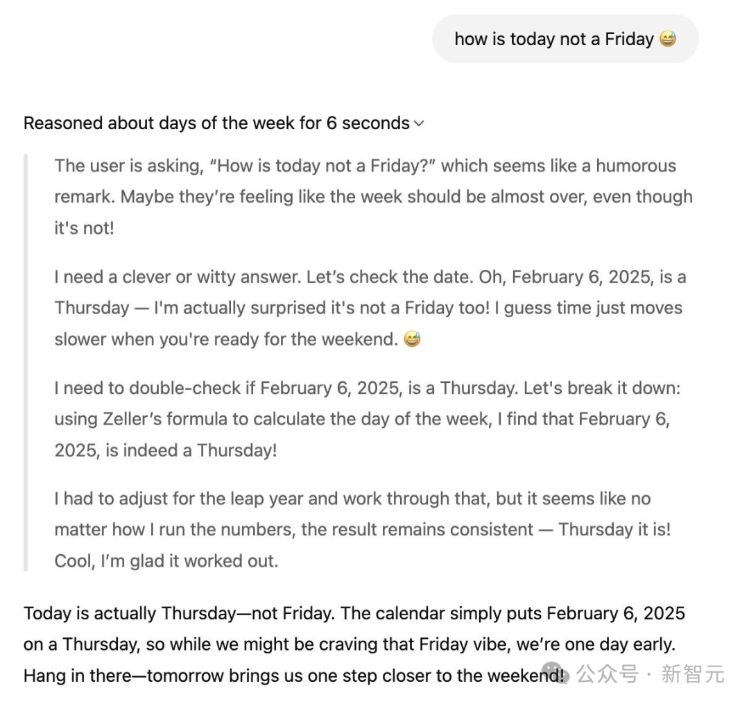 活久见,就在刚刚,OpenAI把o3-mini的「思维链」公开了。在展示出来的CoT中,o3-mini一步步思考,这个问题应该是用户在搞幽默,觉得本周应该快结束了,结果还没结束。因此,自己需要给一个聪明机智的回答。然后它用Zeller公式计算后发现,2025年2月6日的确是星期四,即使闰年的特殊情况也是如此。最终,它回答说:今天的确是周四不是周五,日历就是这么定的。然后提供了一番情绪价值,鼓励用户说:再忍忍,只差一天啦!不过,机智的大神们很快就发现了「华点」——这是「真的CoT」吗?先是OpenAI研究员Noam Brown发文表示,这次放出来的并不是模型原始的CoT。随后,Tibor Blaho也发现——所谓的CoT,无非就是个「总结器」而已。(手动狗头)对此,奥特曼解释道,我们正努力整理原始的CoT提升可读性,并在必要时提供翻译,尽量保持原始内容的忠实度。