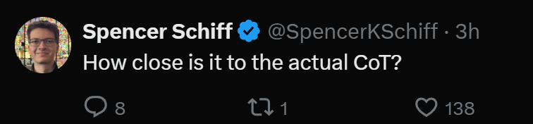 Noam Brown表示,o3-mini是目前第一个能持续正确回答井字棋问题的模型。好笑的是,他承认CoT其实有些不稳定,但可以看到,它最终还是把这个问题给想明白了。有人指出,OpenAI遮遮掩掩地放出这个高仿CoT,其实比什么都不放还要糟。因为真实的CoT可以充当prompt的调试器,帮我们引导模型;而总结性的CoT会造成混淆,引入错误,让调试变得更加困难。而DeepSeek R1最酷的一点,就是暴露了模型的CoT如何影响提示的效果。而且,总结版的CoT显示得很慢。如果是原始的o3-mini,应该在推理中有更快的生成速度。有人也横向对比了OpenAI和DeepSeek的CoT,表示前者看起来实在太专业了,相比之下,还是DeepSeek的产品更自然。