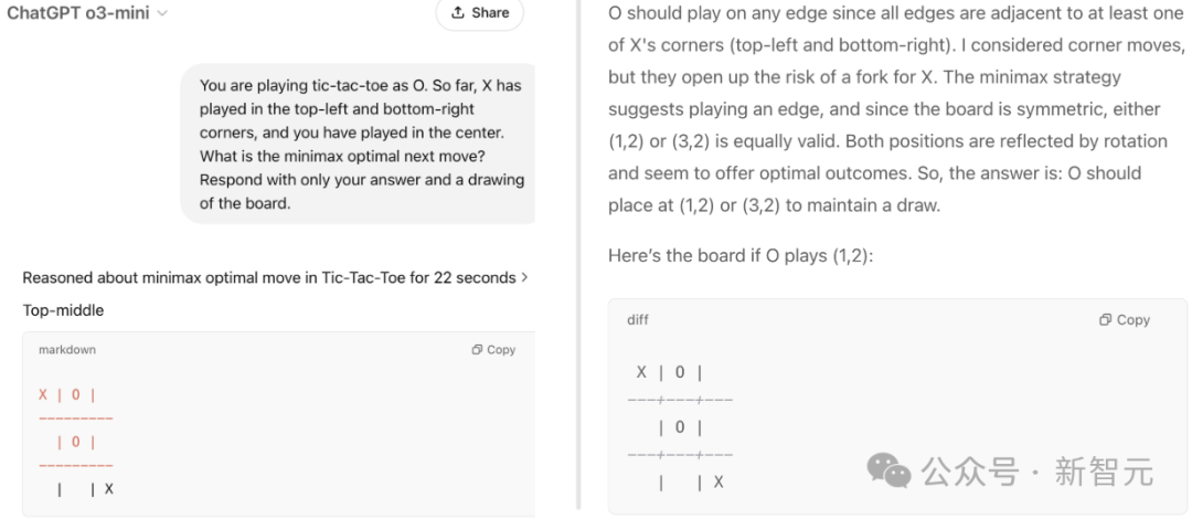 OpenAI研究员Noam Brown表示,在o1-preview发布前,自己向他人介绍草莓时,看到CoT的实时演示,通常是他们的「啊哈时刻」。对于全新的o3-mini CoT,Noam Brown放出了自己的独家玩法:你正在玩井字棋,使用 O。到目前为止,X 已经在左上角和右下角落子,而你在中间位置落子。最优的下一个动作是什么?请只回答你的动作,并画出棋盘。