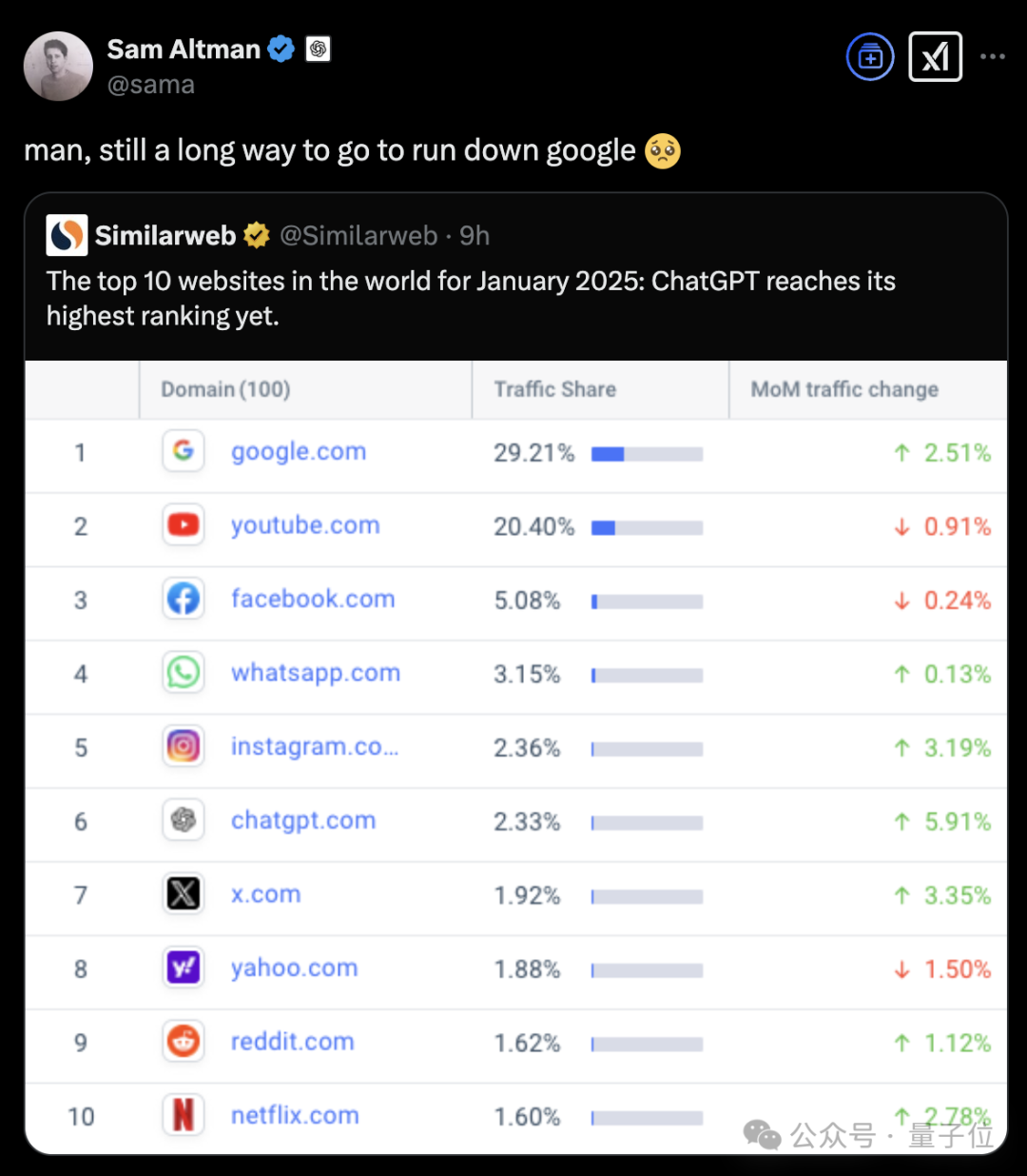 同时他还转发了2025年1月十大网站排名,其中ChatGPT达到史上最高排名(第六),但他表示超越谷歌还有很长的路要走。
