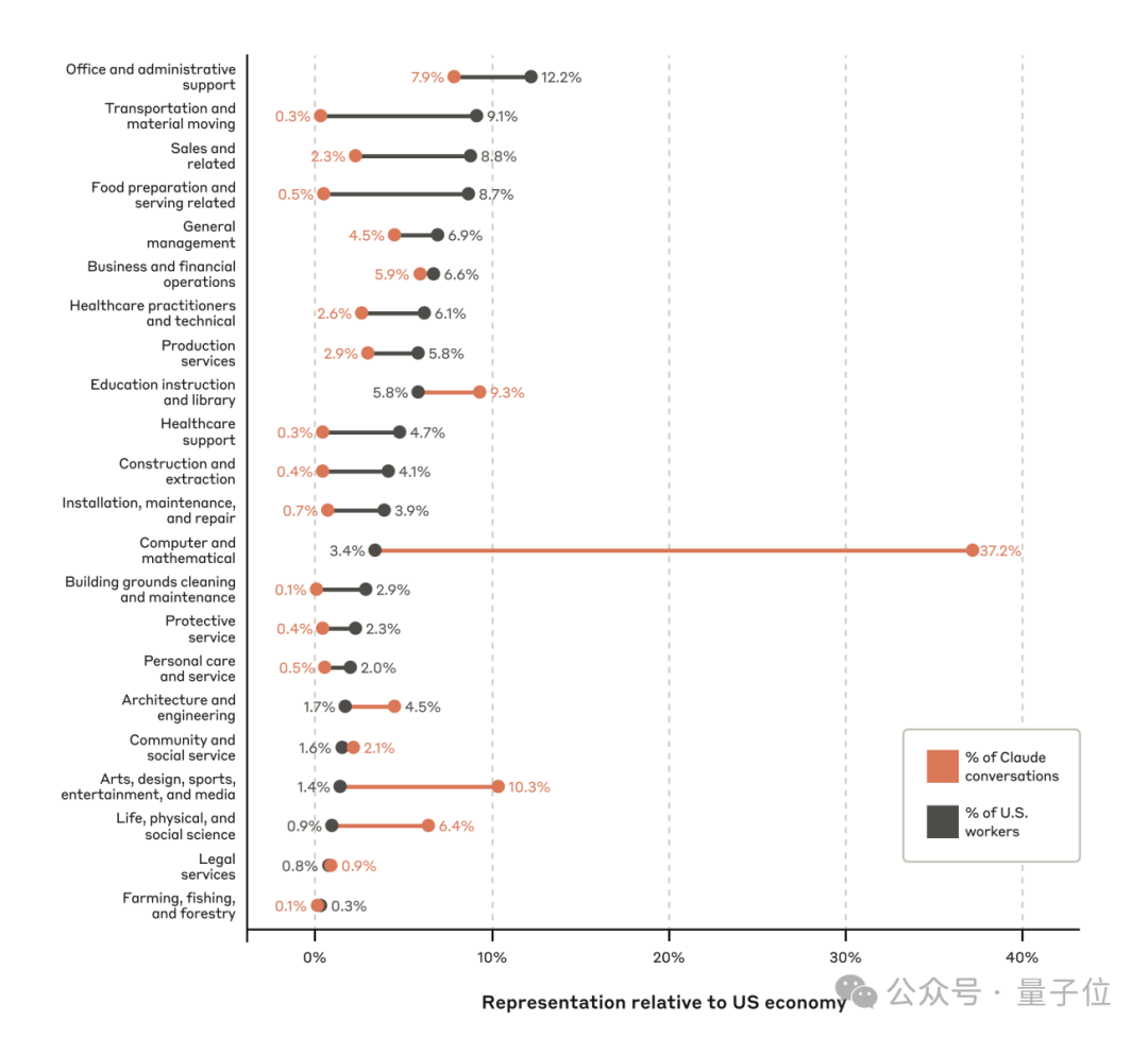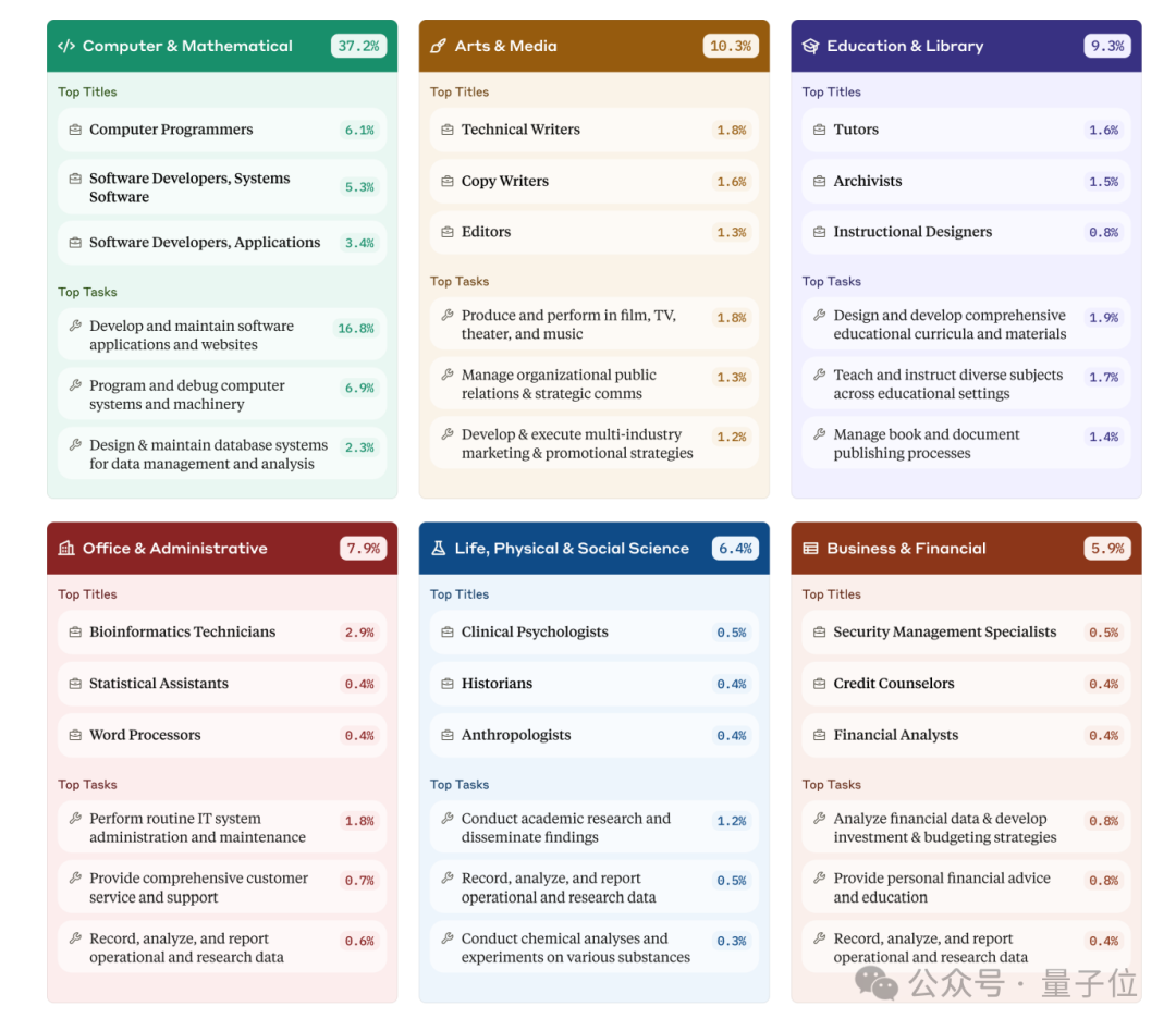 首先,由于软件开发、数据分析等工作高度适配AI技术,因此计算机和数学相关职业的AI使用率最高,占所有查询的37.2%,整体TOP 6如下: