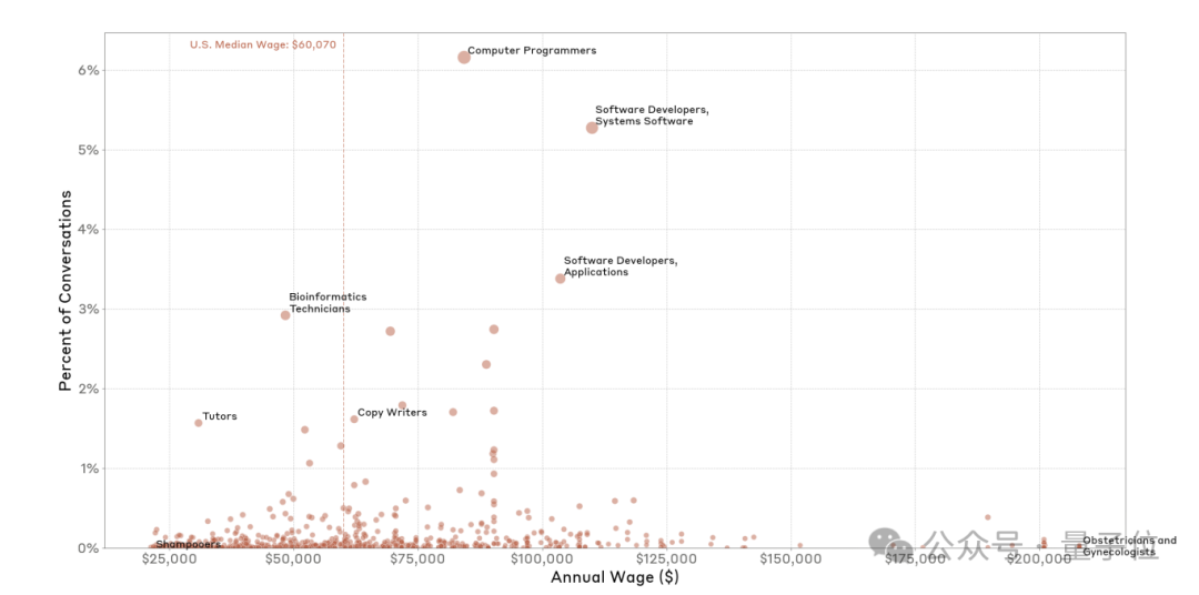 数据显示,AI在中高收入的工作中(如程序员)使用最为普遍;低收入(如服务员)和非常高收入(如麻醉师)的工作中AI使用率则又要低得多,呈现中间多、两边少的形态。