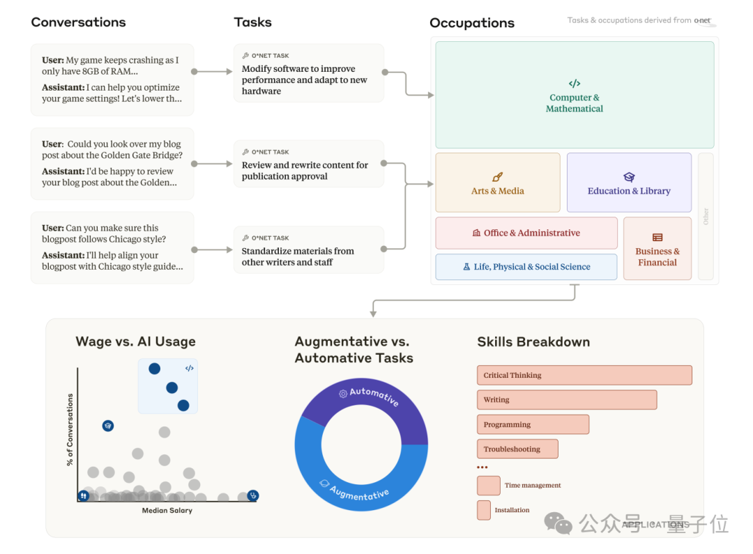 概括而言,通过对Claude平台400万+匿名对话数据的分析,Anthropic构建起了衡量AI在经济活动中使用模式的框架,以此揭示AI在不同任务、职业中的应用情况,并最终探讨了其对经济的影响。